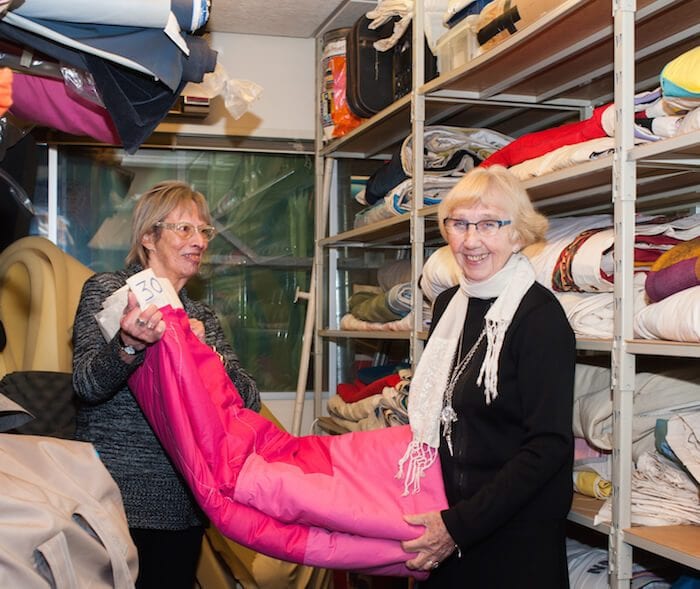 Tonny en Els vertellen dat ze na twintig jaar goed op elkaar zijn ingespeeld. Al het werk gebeurt aan een enorme houten tafel die het atelier bijna helemaal in beslag neemt. ‘We stikken samen de naamvlaggen aan elkaar en ook het repareren van de quilts doen we samen’, aldus Els. ‘Zelfs het opbergen van de quilts gaat volgens vast stramien. Tonny is degene die altijd achteruit loopt. Ach, op een gegeven moment gaat dat vanzelf.’