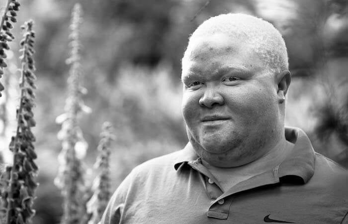 ‘Die verhalen vind ik schokkend en onzinnig. Als albino ben je een gewoon mens. Als jij me in mijn gezicht slaat, voel ik dat en als ik jou in je gezicht sla, voel jij dat zeker ook. In het begin vocht ik tegen alle vooroordelen, maar ik begreep dat ik beter kon laten zien dat ik net zo menselijk ben als een ander. Dat werkte. Ik heb nu op school veel vrienden, zwart, wit, gekleurd – alles door elkaar. Als ik met zwarten ben voel ik me automatisch zwart en met witte mensen wit.’