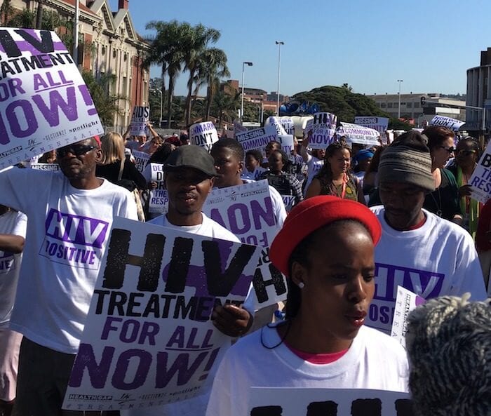 In het park waren al honderden mensen aanwezig, velen droegen in een ‘HIV Positive’ T-shirt. De organisatie achter de demonstratie is Treatment Action Campaign en de coördinator zei ons dat hij vaker protesten had geregeld met zo’n 40.000 mannen en vrouwen, maar omdat hij minder fondsen ontving van de donors kon hij dit keer bij lange na niet zoveel mensen op de been krijgen. Het geld wordt gebruikt voor eten, drinken en vervoer van de menigte naar en van demonstraties.