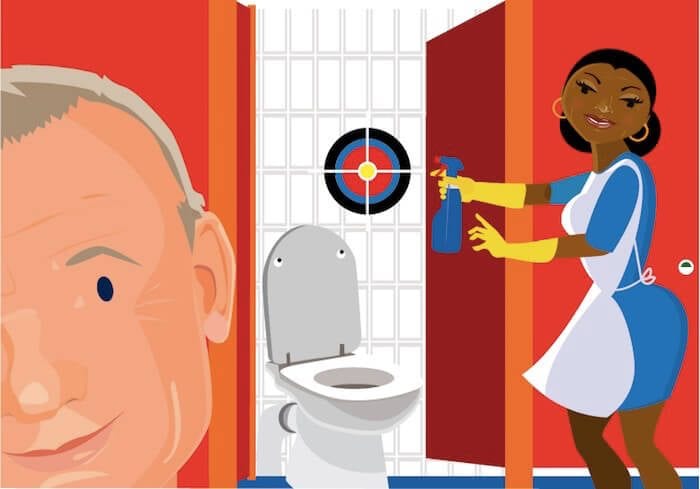 “Kijk, daar, linksboven de wc-pot is de muur het smerigst. Het is gewoon bijna zwart. Daar moet je heel goed schoonmaken met een aparte doek. Het is daar vaak viezer dan de toiletpot zelf! De meeste mannen houden hun plasser in hun rechterhand. Met de linkerhand leunen ze tegen de muur en zo hangen ze boven de pot. Hier moet je heel goed op letten, kind!”