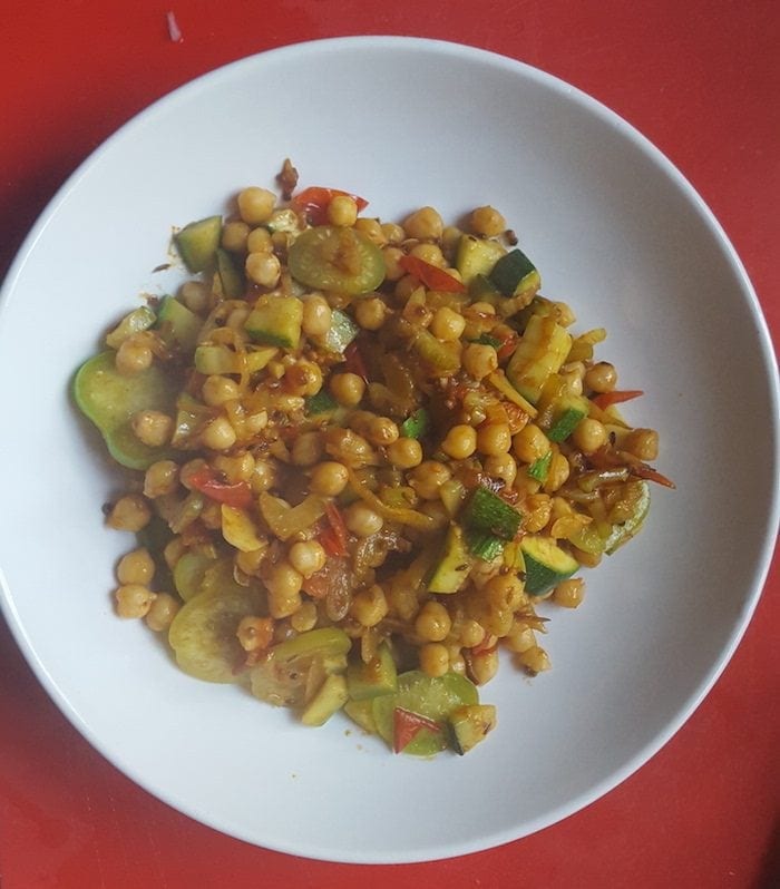 Eens in de zoveel tijd ga ik de voorraadkast door. Dat doe ik om voedsel niet over de datum te laten gaan, maar dit keer ook vanwege een krappe kas. Vakantie met een puber is kostbaar. Maar het is eigenlijk superleuk om zo te koken met wat er beschikbaar is. Uit de tuin komt af en toe een courgette, de kerstomaatjes zijn aan het rijpen en de tomatillo’s, die ik dit jaar als experiment eens zaaide, blijken overheerlijk. En in de kast vond ik een pak gedroogde kikkererwten. Meteen in de week gezet. Het hele pak, want kikkererwten kun je gekookt best een paar dagen in de koelkast bewaren. En dat er van die kikkererwten ook humus wordt gemaakt is vanzelfsprekend. Met verse munt, ook uit de tuin. Maar eerst de curry.